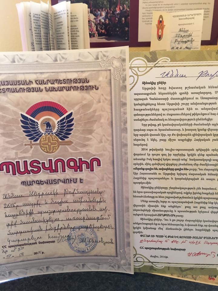 2016 թ. Ապրիլ-մայիս ամիսներին Հայրենիքի պաշտպանությանն ակտիվ մասնակցելու, առաջնագծում մարտական խնդիրները բարեխղճորեն կատարելու համար` պատվոգրով ( ՀՀ Պաշտպանության Նախարարի 17.08. 2016 N 899 հրամանով):